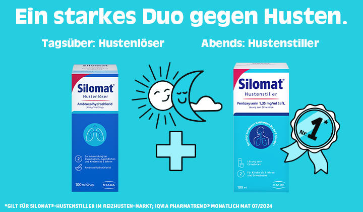 Ja, die kombinierte Einnahme des Ambroxol-Produkts mit Hustenstillern ist möglich und kann sogar den Therapieerfolg bei produktivem Husten verbessern. Dabei wird der Silomat®-Hustenlöser am Tag und ein Hustenstiller für die Nacht empfohlen. Sie haben die Wahl zwischen:
